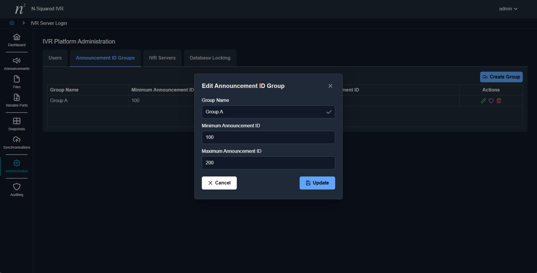 The IVR GUI provides a group restriction mechanism that allows administrators to control access to announcement ID ranges. This mechanism allows a user to be given access to a subset of announcements (e.g. announcements related to a wholesale customer) while restricting access to announcements used for voice services (e.g. system error messages).