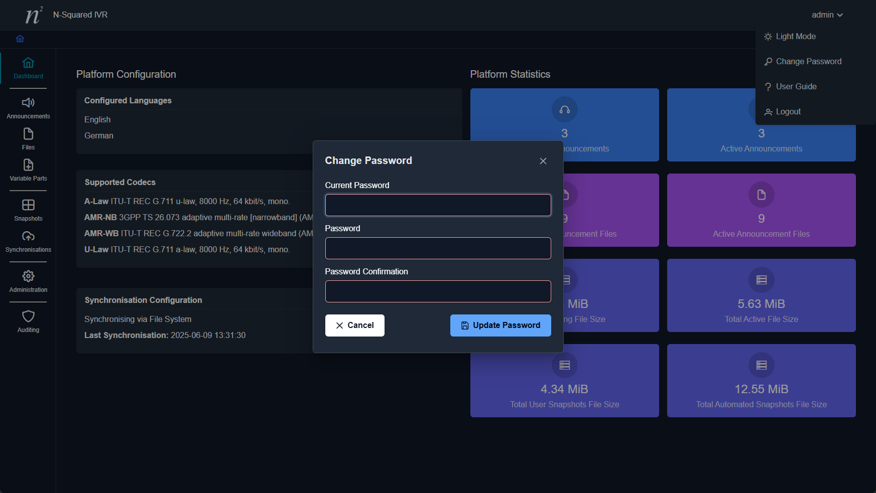 An administrator may update any user password (including their own) through the user edit dialog.