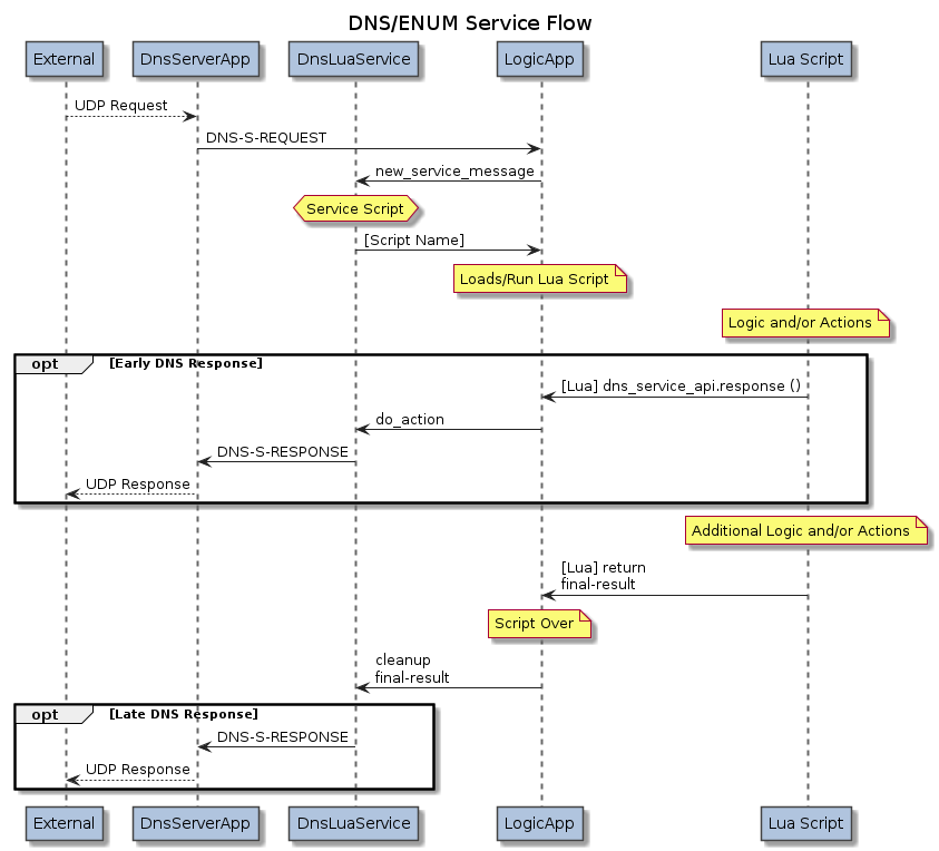 The DnsLuaService receives messages from one or more instances of the DnsServerApp which is configured to receive DNS (typically ENUM) Requests from an external client.