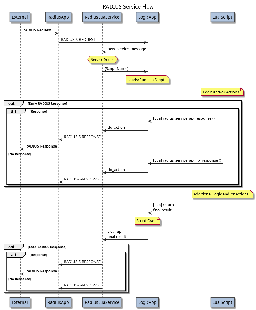 The RadiusLuaService receives messages from one or more instances of the RadiusApp which is configured to receive RADIUS Requests from an external client.