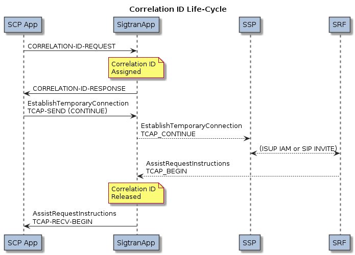 The CORRELATION-ID-… messages are used by “SCP-style” applications to request SigtranApp to assign a temporary Correlation ID for the purposes of correlating an INAP/CAP AssistRequestInstructions back to the associated call instance.
