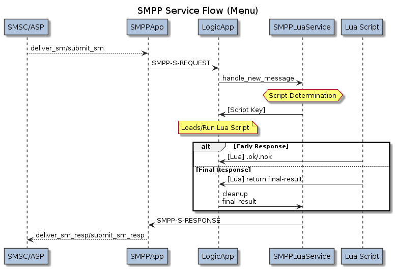 The SMPPLuaService coordinates the loading of a Lua script. The script logic will perform any processing,