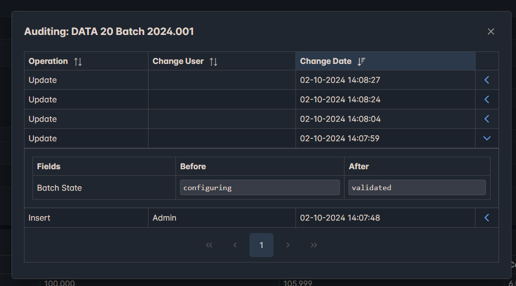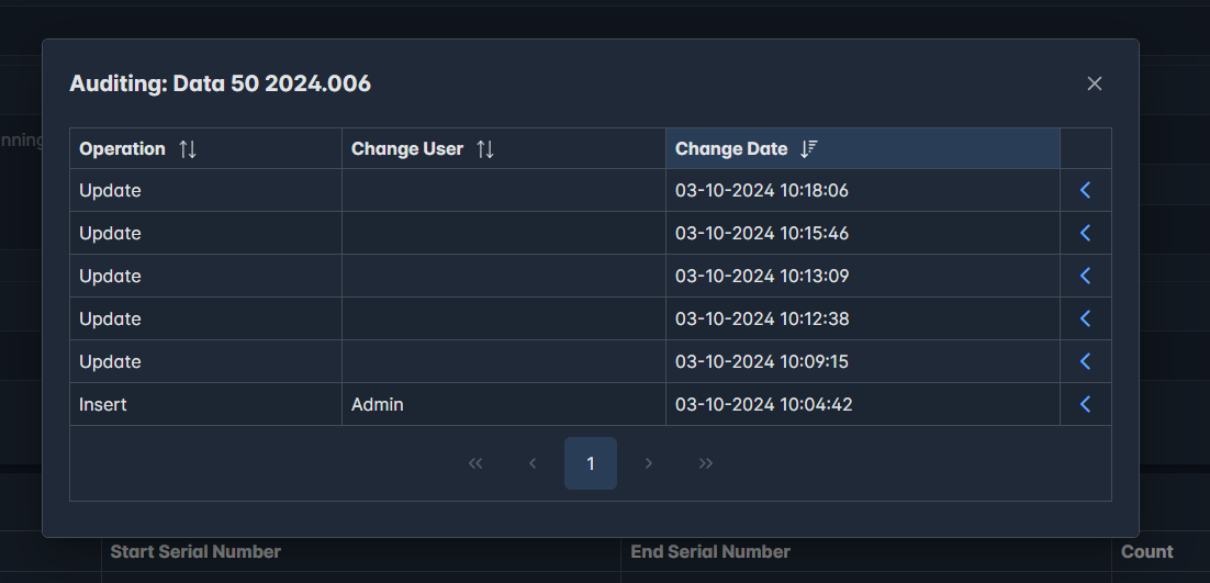 Selecting an Auditing button will display the Auditing dialog, this is the same component for each screen which supports auditing and will display a row for each time the parent record has changed.