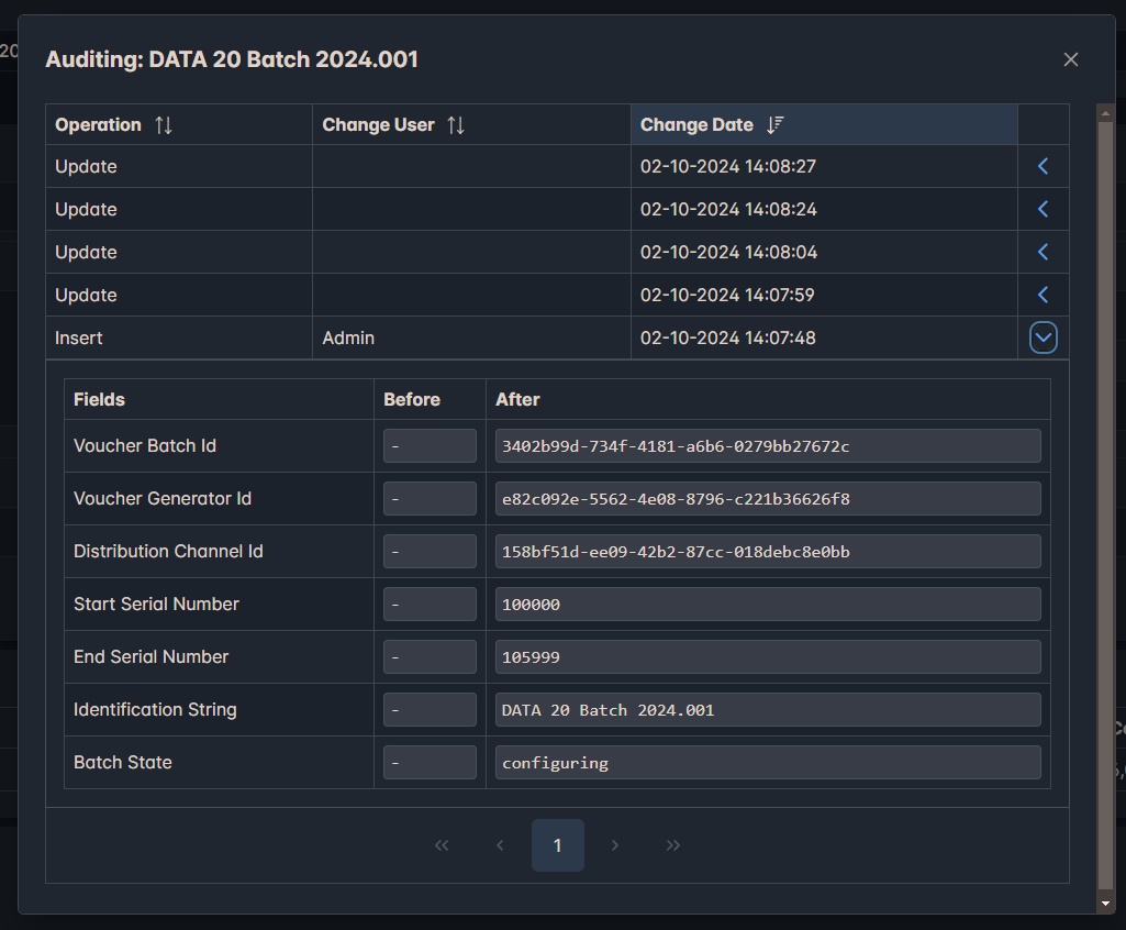 The Voucher Server supports in-depth auditing of all components that are editable via the GUI application.