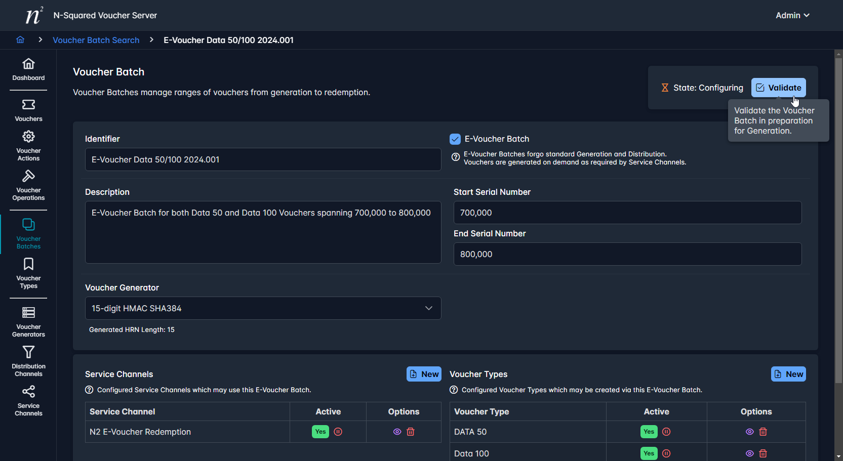 | Validated | The E-Voucher Batch configuration has been validated and is valid for activation. |