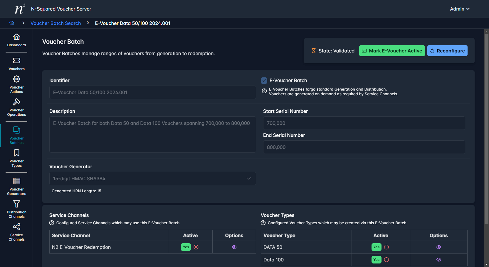 Selecting Mark E-Voucher Active will enable the E-Voucher Batch such that Voucher Type generation may be requested and Vouchers redeemed by the actively configured Service Channels.