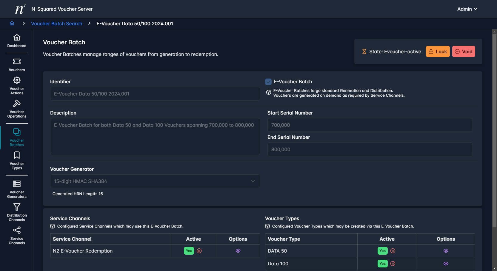 Lock- Lock the E-Voucher Batch. Voucher generation cannot be requested. Vouchers cannot be redeemed.Void- Void the E-Voucher Batch. All actions are unavailable and the batch is voided.