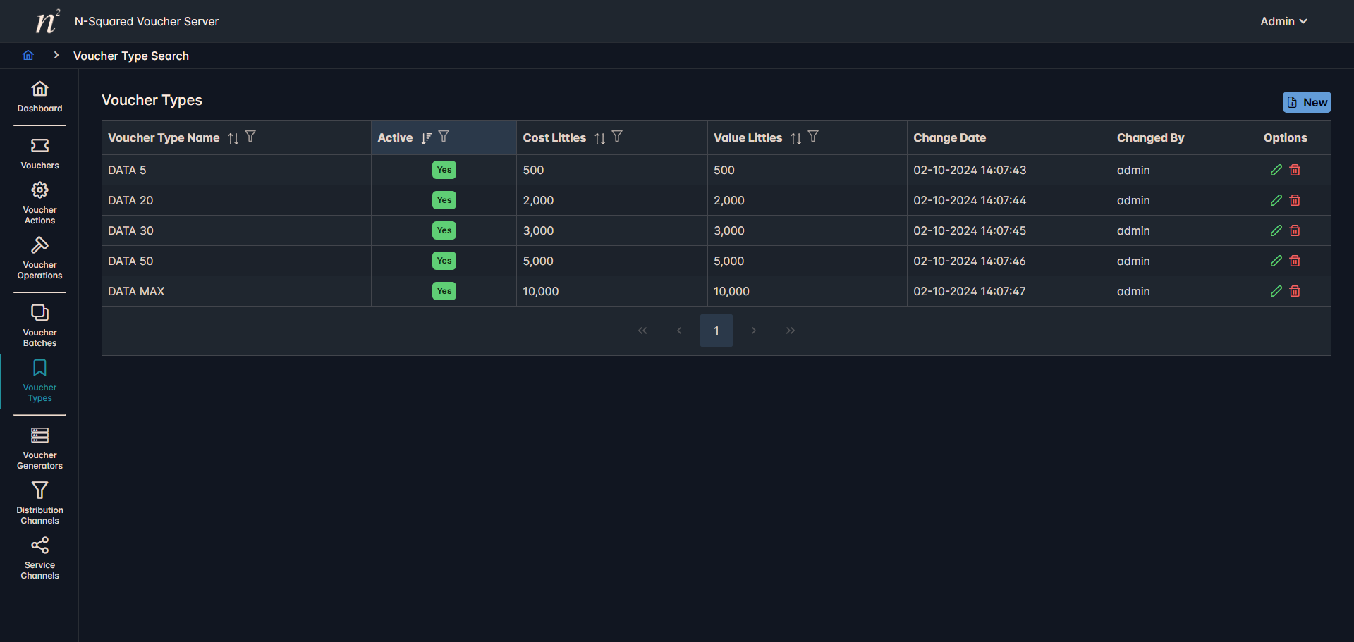 All configured Voucher Types will be shown with standard features for searching and sorting available via the table controls.